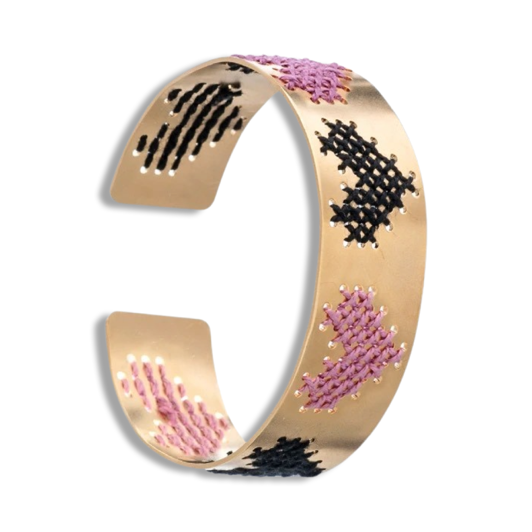 Βραχιόλι από επιχρυσωμένο ορείχαλκο και κεντημένες καρδιές με κλωστή σε ροζ και μαύρο χρώμα.