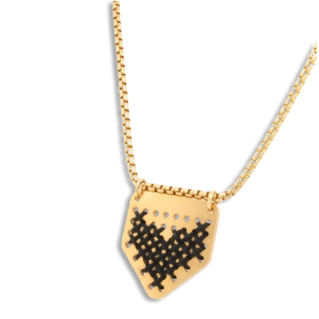 Χειροποίητο κολιέ επιχρυσωμένο, με ατσάλινη αλυσίδα & ορειχάλκινο γεωμετρικό σχέδιο κεντημένο με μαύρο νήμα.