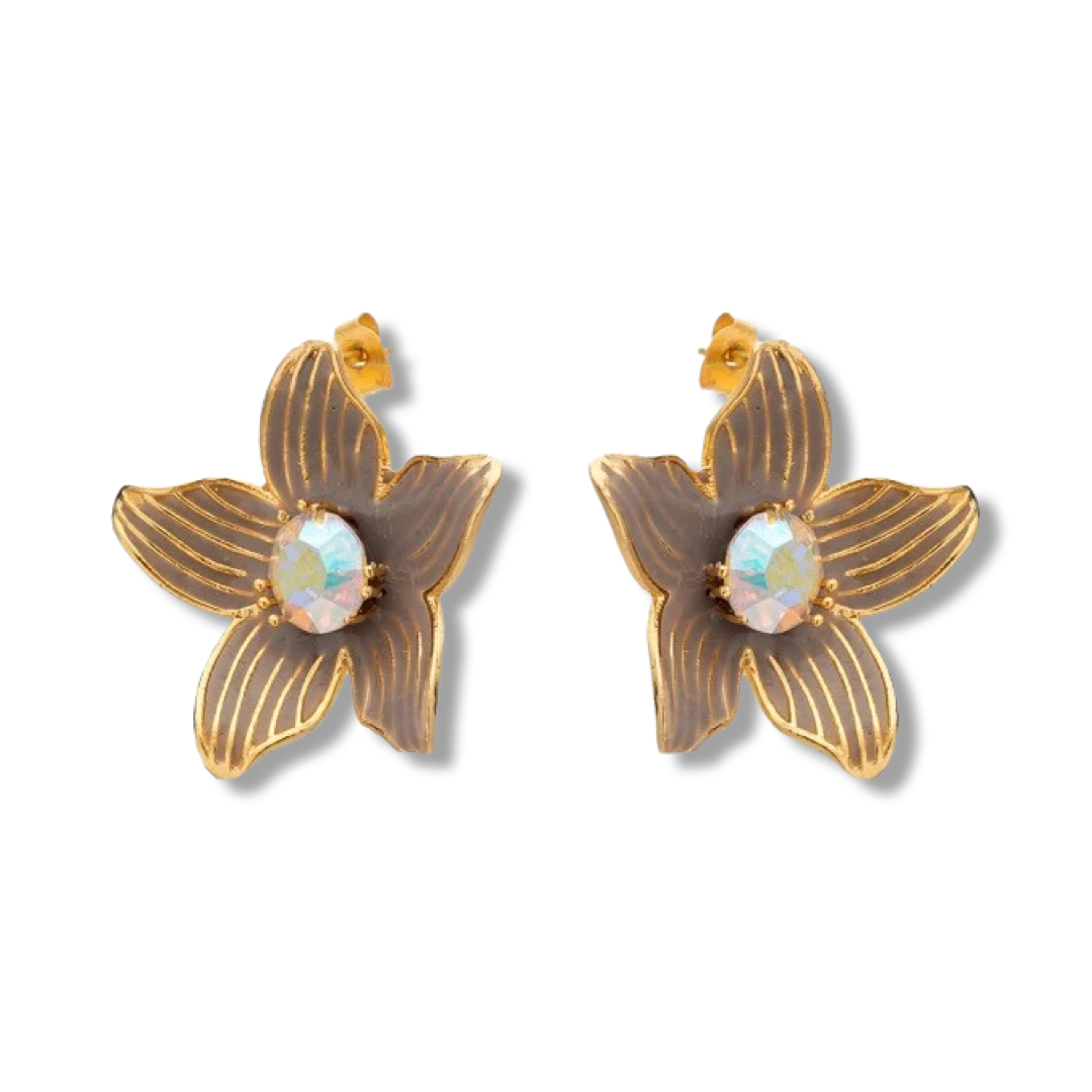 Χειροποίητα καρφωτα σκουλαρίκια σε σχήμα λουλουδιού , από επιχρυσωμένο ορειχαλκο , γκρι σμάλτο & στρας Swarovski.