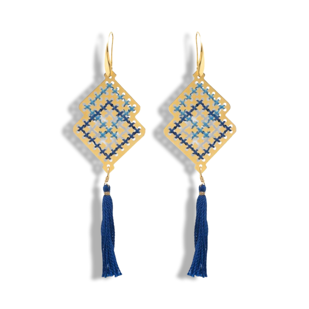 Χειροποίητα boho σκουλαρίκια επιχρυσωμένα, με πολυγωνικό στοιχείο κεντημένο σταυροβελονιά με μπλε, γαλάζια και λευκή κλωστή.