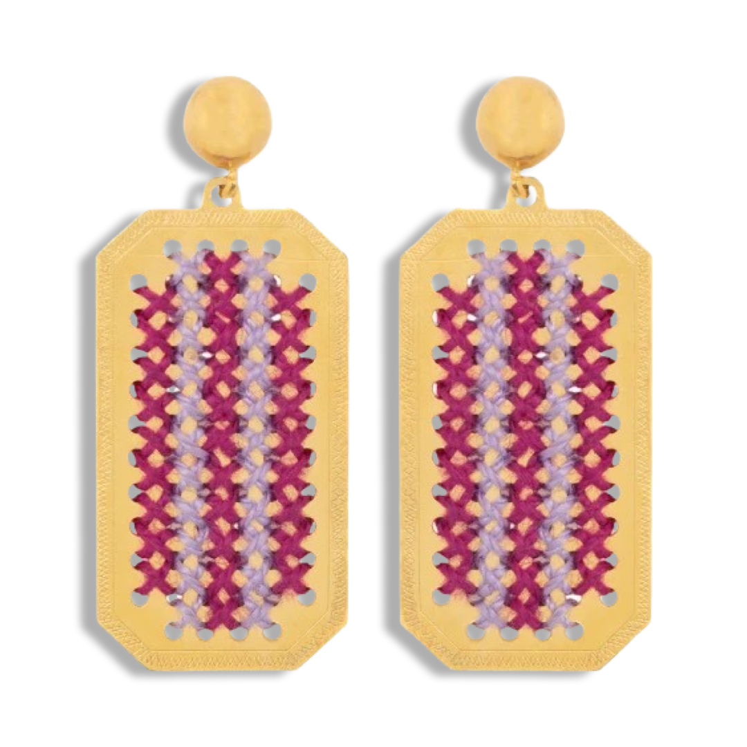 Χειροποίητα επιχρυσωμένα σκουλαρίκια με κρεμαστό παραλληλόγραμμο, κεντημένο με φούξια και λιλά κλωστή.