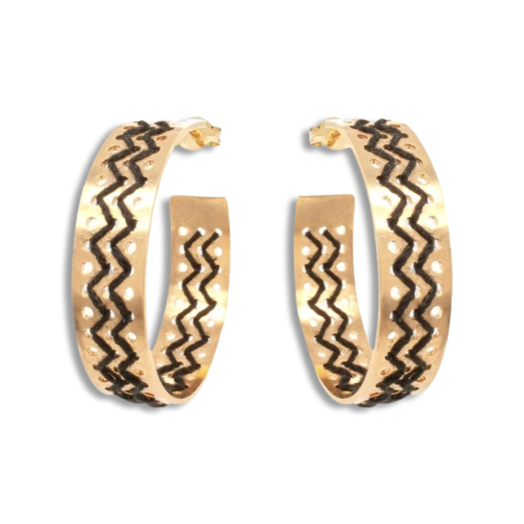 Χειροποίητα σκουλαρίκια κρίκοι επιχρυσωμένοι 24κ κεντημένα με μαύρο νήμα.