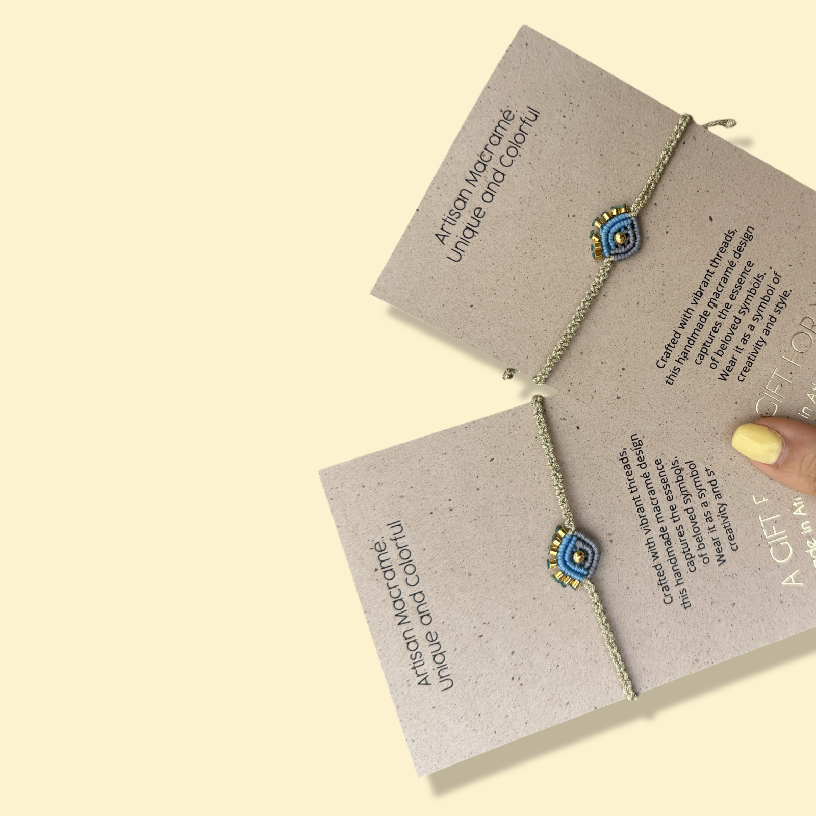 Χειροποίητο μακραμε βραχιολάκι σε σχήμα ματι , σε γαλάζια απόχρωση & χρυσοκλωστή.